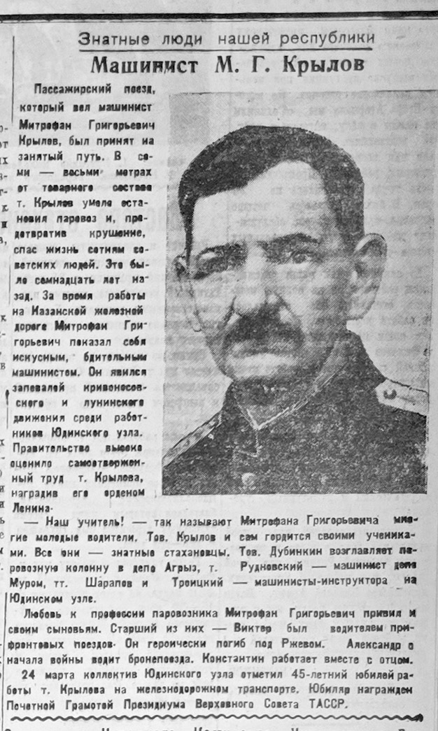 В рубрике «Знатные люди нашей республики» газета рассказал о машинисте Митрофане Крылове, который 45 лет проработал на юдинском узле Казанской железной дороги. Однажды он вел пассажирский поезд, и диспетчер по ошибке направил его состав на путь, уже занятый товарняком. Крушение было практически неминуемо, но машинист Крылов быстро сориентировался, остановил поезд с пассажирами в 7-8 метрах от товарняка и спас жизни сотен людей. Это было в 1928 году.