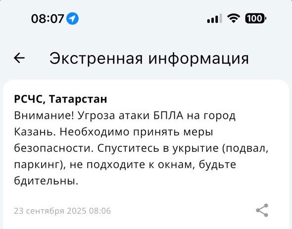 Напомним, режим «Беспилотная опасность» объявляется в Татарстане в случае выявления беспилотников, которые направляются в республику. Если дроны обнаружены на территории региона, то вводится режим «Угроза атаки БПЛА». Подробнее читайте в материале «РТ» Воздушная угроза: жителям Татарстана объяснили, как реагировать на СМС о беспилотниках.