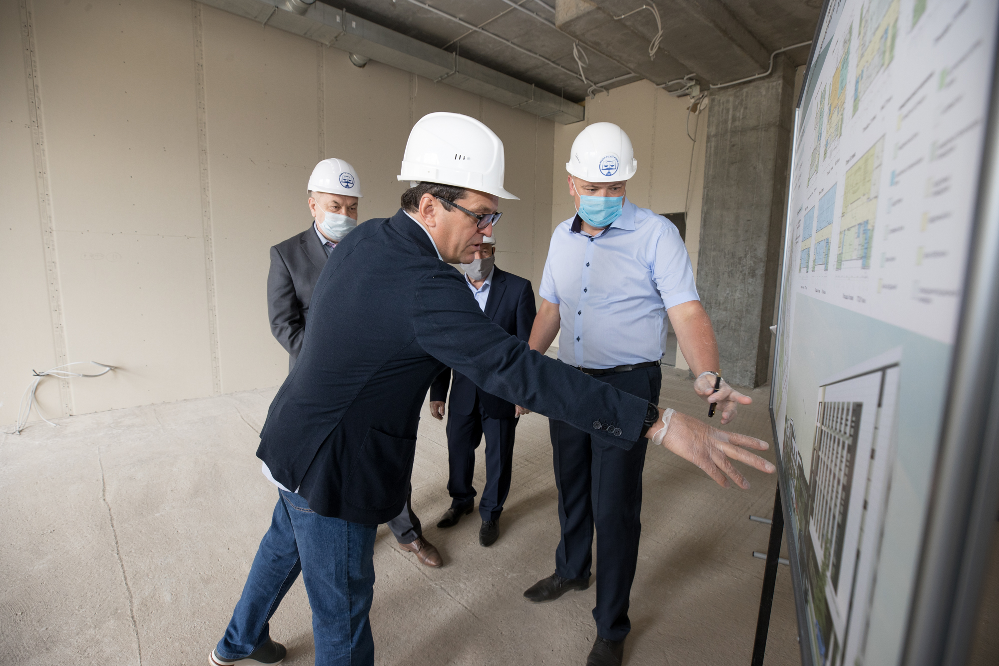 Сейчас учебный корпус готов на 65-70%. Рабочие монтируют навесной фасад, перегородки, системы вентиляции, кондиционирования, сети электроснабжения, внутренние инженерные сети, остекляют окна. Благоустраивают прилегающую территорию.