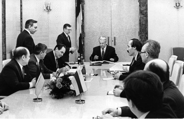 Российскую делегацию возглавил Государственный секретарь, второй человек в администрации Ельцина, Геннадий Эдуардович Бурбулис. Это человек большого ума, умеющий принимать решения соответственно требованиям времени. В составе делегации были советники российского Президента С.М.Шахрай, С.Б.Станкевич, министр юстиции российского Правительства, в будущем президент Чувашии Н.Ф.Фёдоров, первый заместитель министра иностранных дел Ф.В.Шелов-Коведяев.