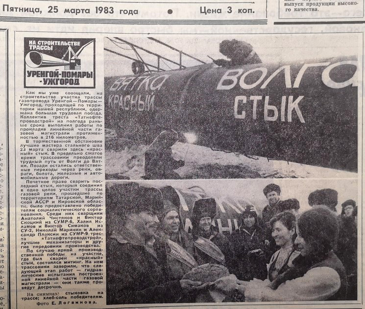 Вести со строительства магистрального газопровода Уренгой — Помары — Ужгород, который проходил через ТАССР, наша газета в 1983 году публиковала регулярно на первой полосе. Стальная «нитка» диаметром 1420 мм и протяженностью 4500 км должна была соединить месторождения Западной Сибири с потребителям в республиках СССР и странах Европы.