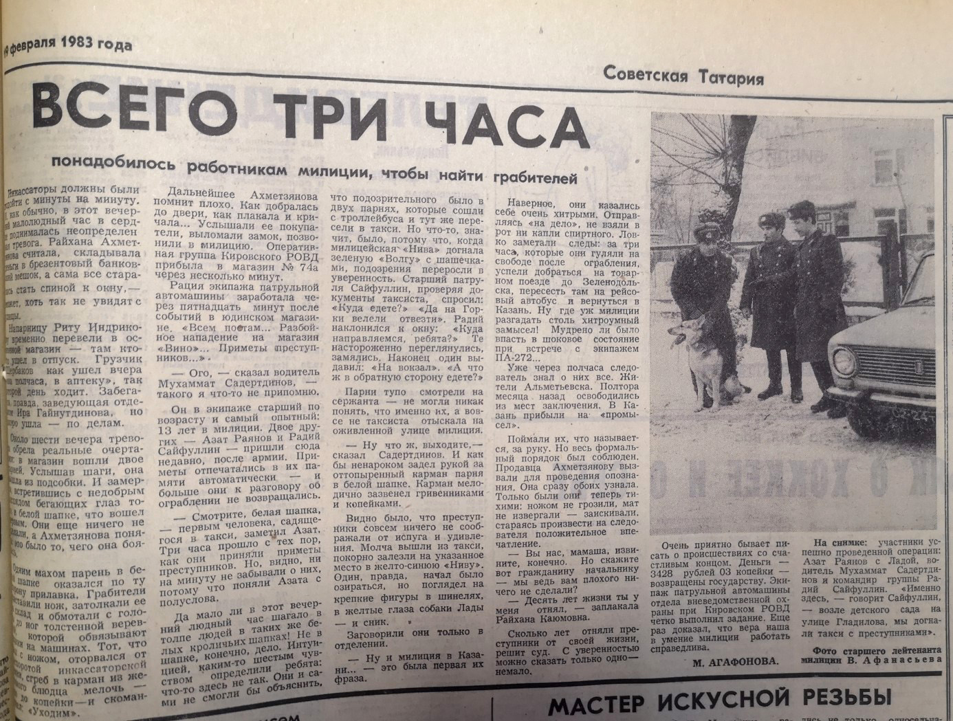 Связанная продавщица кое-как добралась до входной двери, плакала, кричала, просила о помощи. Ее услышали, выломали замок, позвонили в милицию. Тем временем грабители путали следы — на товарном поезде они доехали до Зеленодольска, оттуда на рейсовом автобусе вернулись в Казань, пересели на такси.