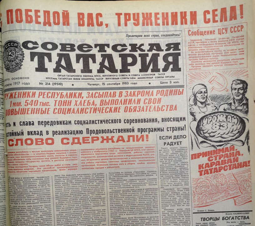 15 сентября «Советская Татария» вышла с красными заголовками на первой полосе (обычные номера были черно-белыми и только по праздникам рисунки и заголовки выделяли красным цветом). В этот раз газета чествовала тружеников села, которые засыпали в закрома Родины 1,54 млн тонн хлеба, выполнили повышенные социалистические обязательства.