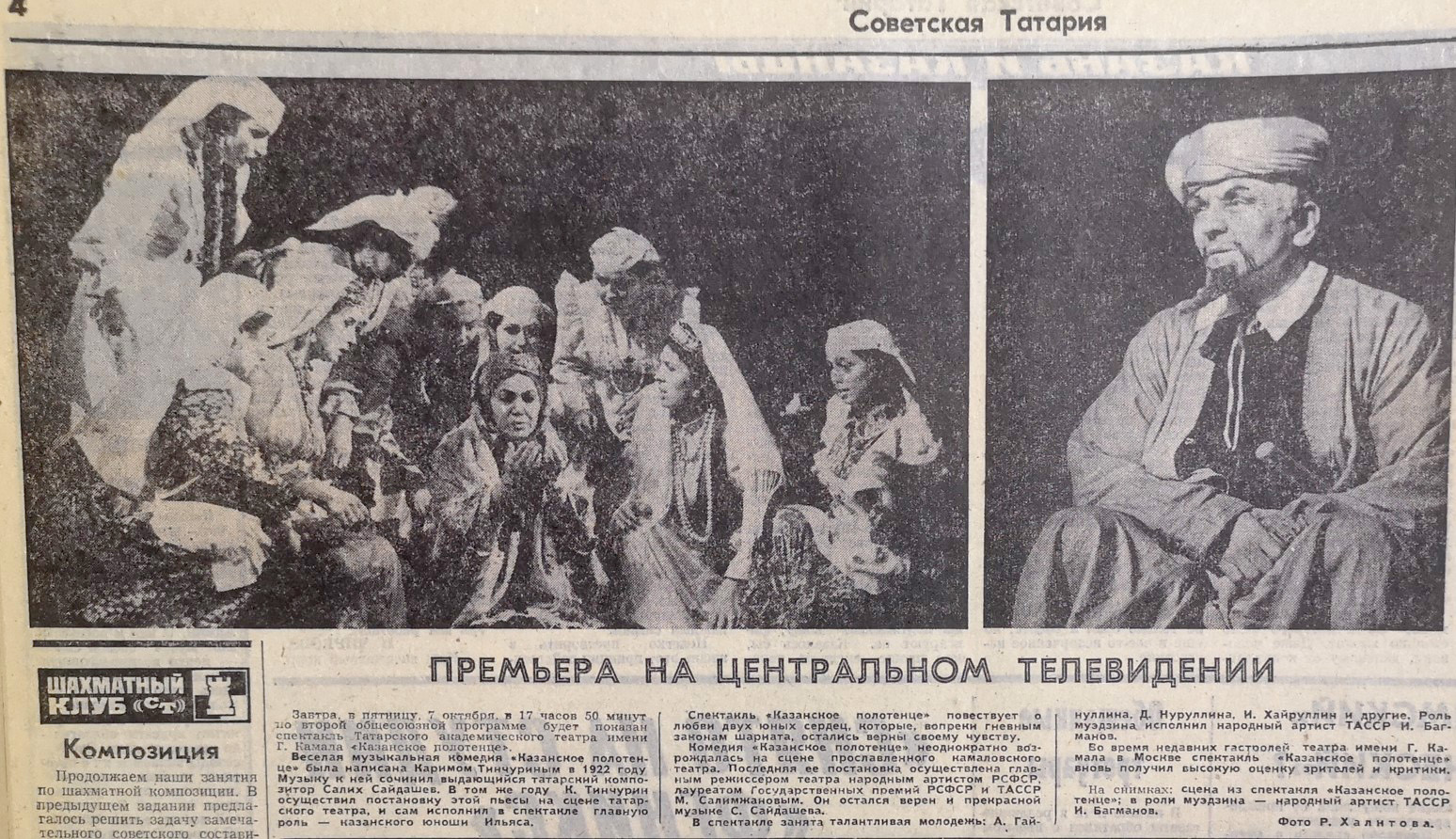В 1983 году с успехом прошли гастроли Татарского академического театра им. Г.Камала в Москве. В частности, высокую оценку зрителей и критиков получил спектакль «Казанское полотенце». Веселая музыкальная комедия была написана Каримом Тинчуриным в 1922 году. Музыку к ней сочинил выдающий татарский композитор Салих Сайдашев.