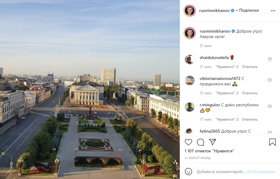 Сегодня утром в День Республики Татарстан Президент Рустам Минниханов опубликовал в своём Инстаграм фото из рабочего кабинета. Глава республики по традиции ежедневно выкладывает фотографию с видом на площадь Свободы.