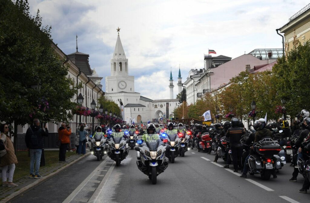 Мотоциклисты выстроились в колонну на площади 1 Мая. У Спасской башни к ним присоединился Рустам Минниханов, после чего байкеры направились к Центру семьи «Казан».
