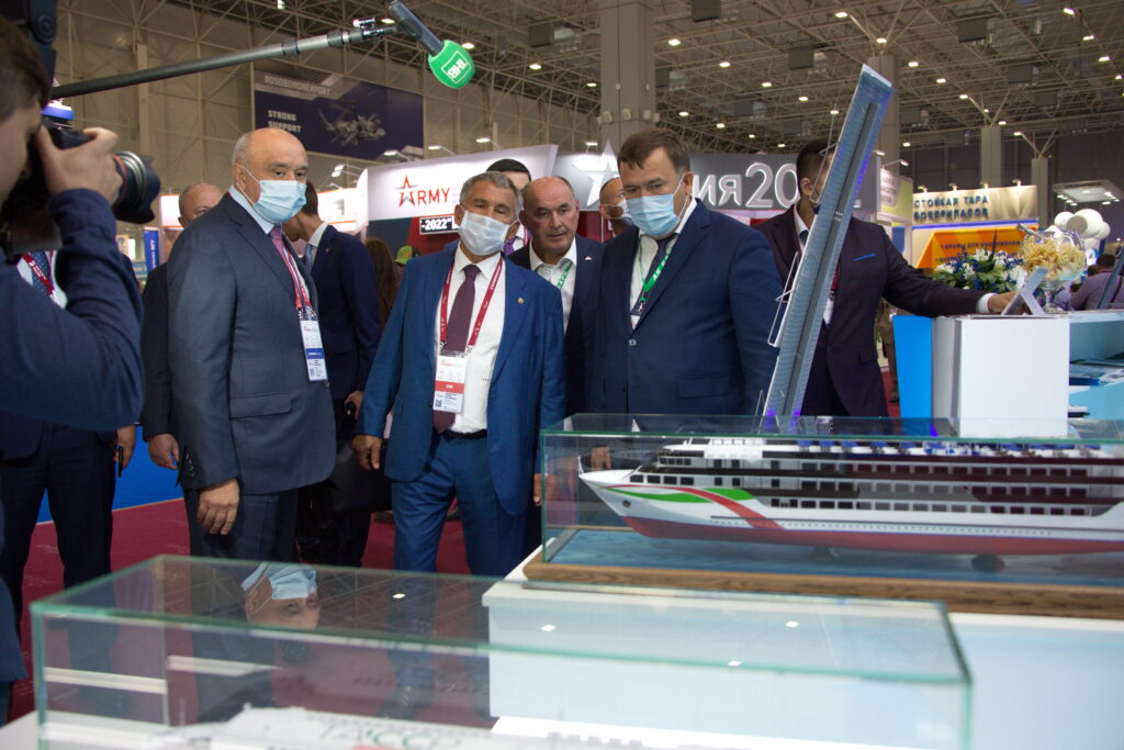 На площадке «Ак Барс Холдинг» Президенту Татарстана презентовали макет пассажирского теплохода на подводных крыльях «Метеор-2020» и рассказали о других проектах, реализуемых на Зеленодольском судостроительном заводе.