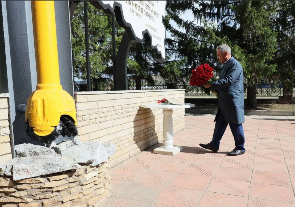 Рустам Минниханов возложил цветы к мемориальному комплексу «Скважина № 1» в селе Шугурово.