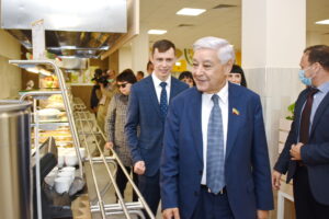 Затем Фарид Мухаметшин подарил школе денежный сертификат и комплект волейбольных мячей. Гости побывали в учебных классах и лабораториях, осмотрели плавательный бассейн, посетили школьный ресторан. В фойе, где размещены электронные стенды управления учебным и воспитательным процессом, руководитель лицея проинформировал Фарида Мухаметшина об особенностях применяемых в школе современных педагогических и управленческих методик, индивидуальном треке ученика в приложении, уровне педагогического коллектива.