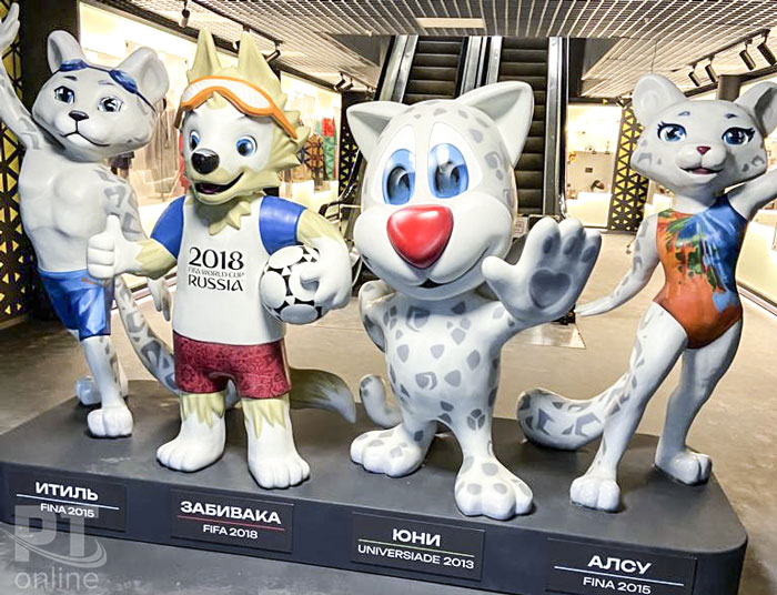 На входе посетителей встречает квартет красивых талисманов. Это Юни, запомнившийся по Всемирной универсиаде 2013 года, Забивака, поразивший всех гостеприимством на мундиале 2018 года, а также Итиль и Алсу, сопровождавшие участников чемпионата мира по водным видам спорта 2015 года. И сразу появляется желание задержаться с этими «ребятами» подольше и сделать фото на память.