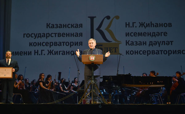 Президент Татарстана Рустам Минниханов принял участие в торжественном вечере, посвящённом 75-летию создания Казанской государственной консерватории имени Н.Г.Жиганова. Мероприятие прошло в Татарском академическом театре оперы и балета им. М.Джалиля.