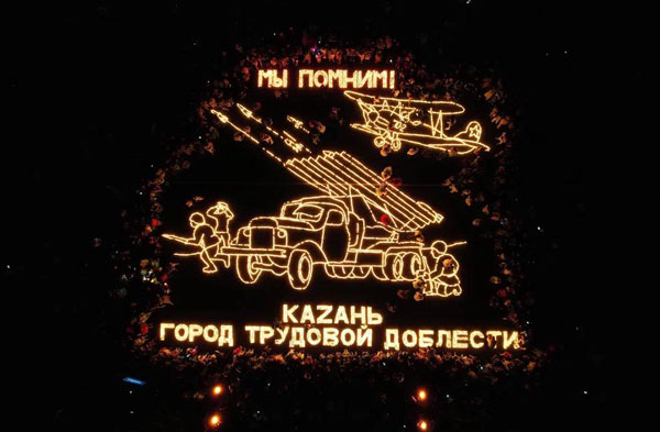 В Казани прошла ежегодная международная акция «Огненные картины войны», приуроченная ко Дню памяти и скорби. Из двадцати тысяч свечей молодёжные активисты и жители города выложили изображение советских солдат, «катюши» и бомбардировщика По2, который во время Великой Отечественной войны производился в Казани.