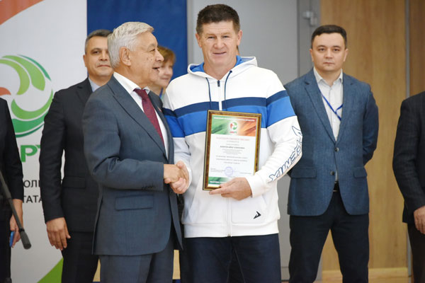Председатель Госсовета от имени Федерации волейбола Татарстана вручил волейбольному активу Кукморского района спортивный инвентарь, а также благодарственные письма.