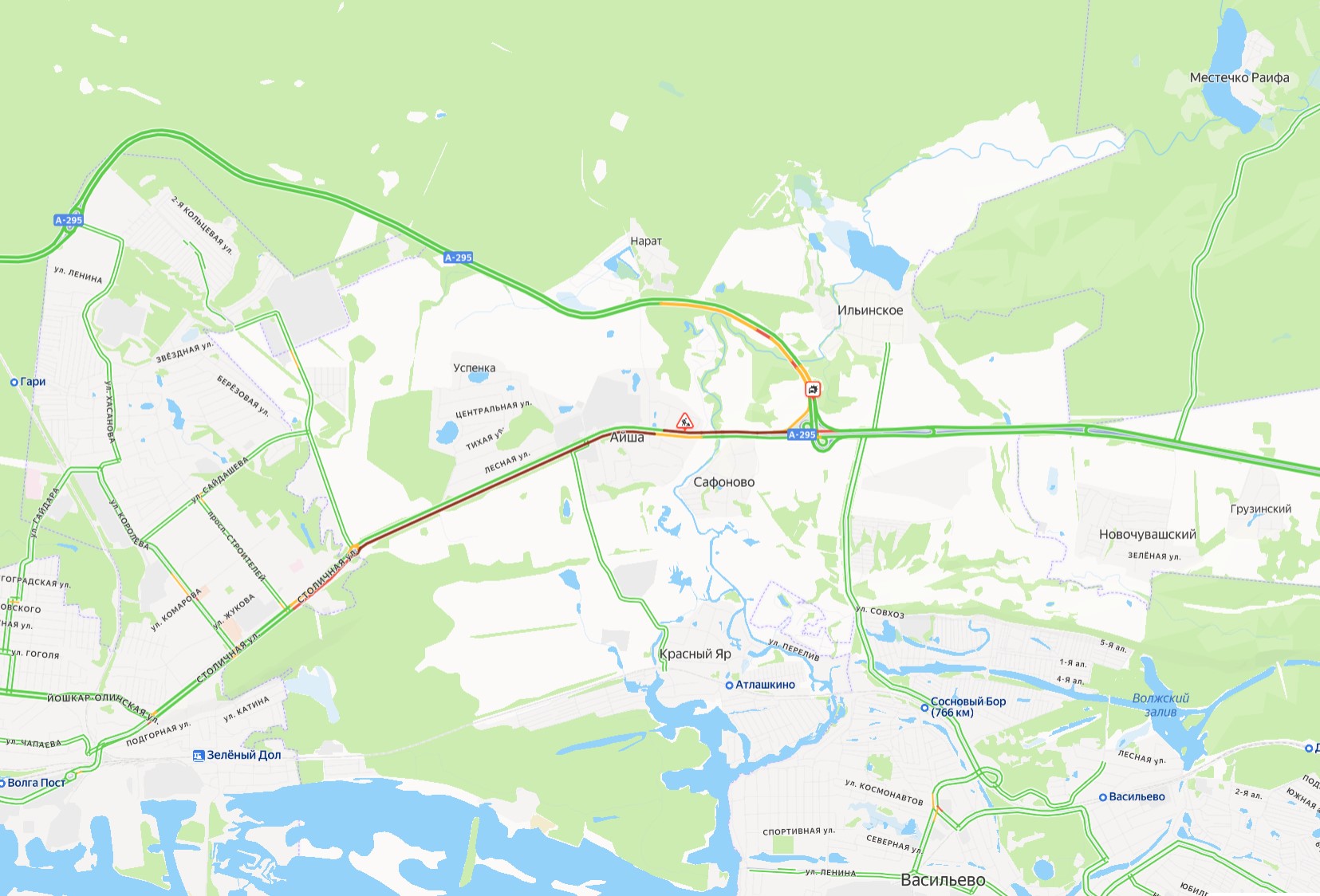 На выезде из Зеленодольска в сторону Казани образовалась многокилометровая пробка — она начинается на улице Столичная и тянется до деревни Сафонова.