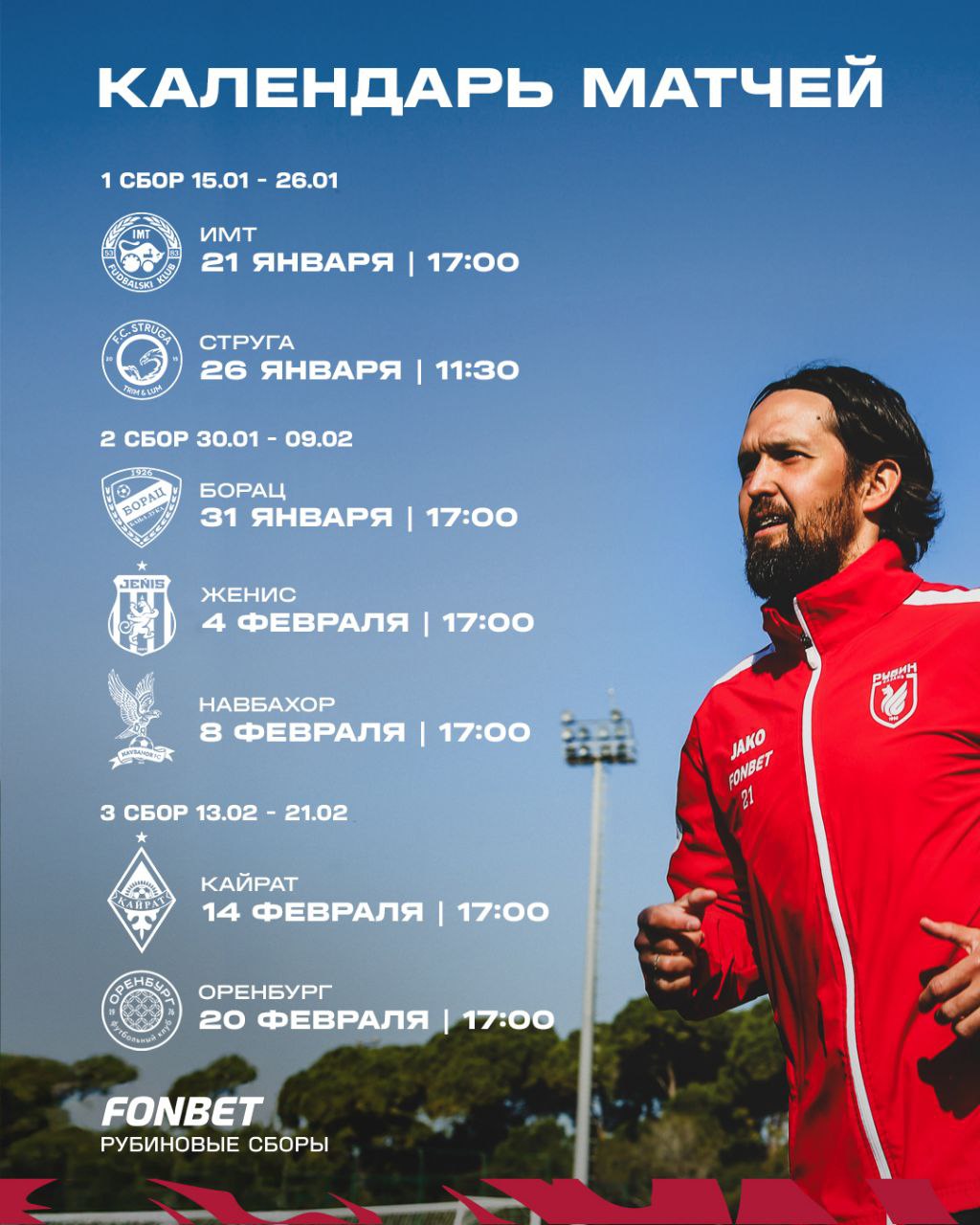 Ранее «Рубин» опубликовал календарь матчей во время сборов, которые пройдут с 21 января по 20 февраля.