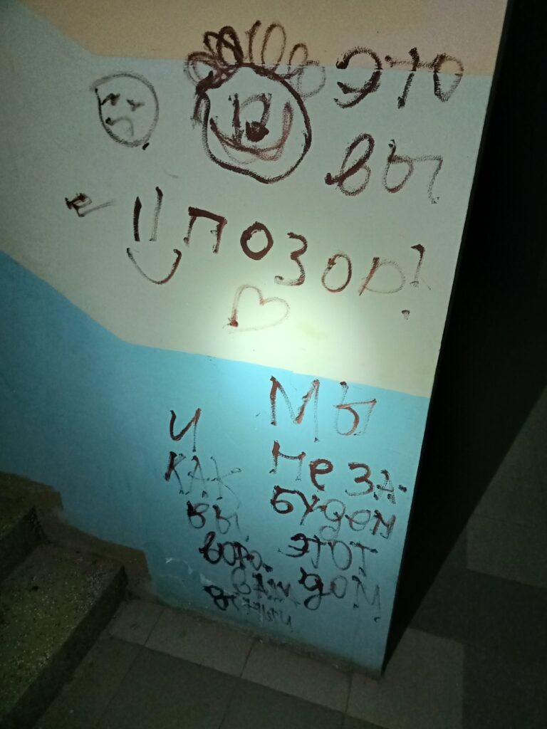На прощанье кто-то из покидающих аварийный дом жильцов оставил на стене в подъезде прощальную надпись: «Мы не забудем этот дом и как вы воровали деньги». Видимо, упрек в адрес застройщика.