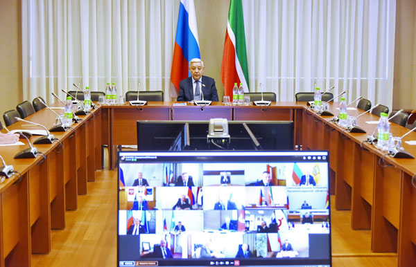 Сегодня Председатель Госдумы Вячеслав Володин провёл совещание с руководителями законодательных органов власти регионов в режиме видеоконференцсвязи. Участие в совещании принял Председатель Государственного Совета РТ Фарид Мухаметшин.
