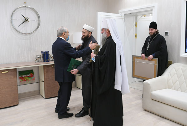 Одними из первых поздравили Минтимера Шариповича муфтий Татарстана Камиль Самигуллин и митрополит Казанский и Татарстанский Кирилл. Представители духовенства поблагодарили юбиляра за бесценный вклад, который он вносит в сохранение наследия. Митрополит Казанский и Татарстанский зачитал поздравление от имени Святейшего Патриарха Московского и всея Руси. А муфтий Татарстана вручил Государственному Советнику РТ орден Ш.Марджани первой степени.