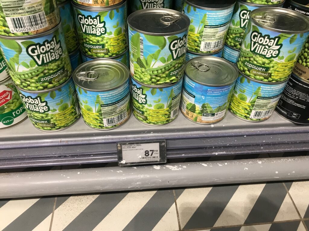 Банка зеленого горошка объемом 380 - 400 г (самого горошка в такой банке примерно 250 г) стоила в прошлом году в среднем 87,55 рубля, сейчас – 87,99.