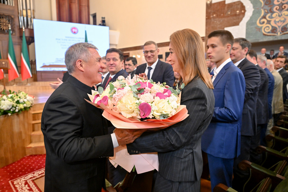 Он передал слова благодарности Президенту России Владимиру Путину за личную поддержку и внимание к республике, а также Правительству страны во главе с Премьер-министром Михаилом Мишустиным. Отдельные слова благодарность он выразил первому Президенту Татарстана, Герою Труда Минтимеру Шаймиеву, который также находился в зале среди почетных гостей.