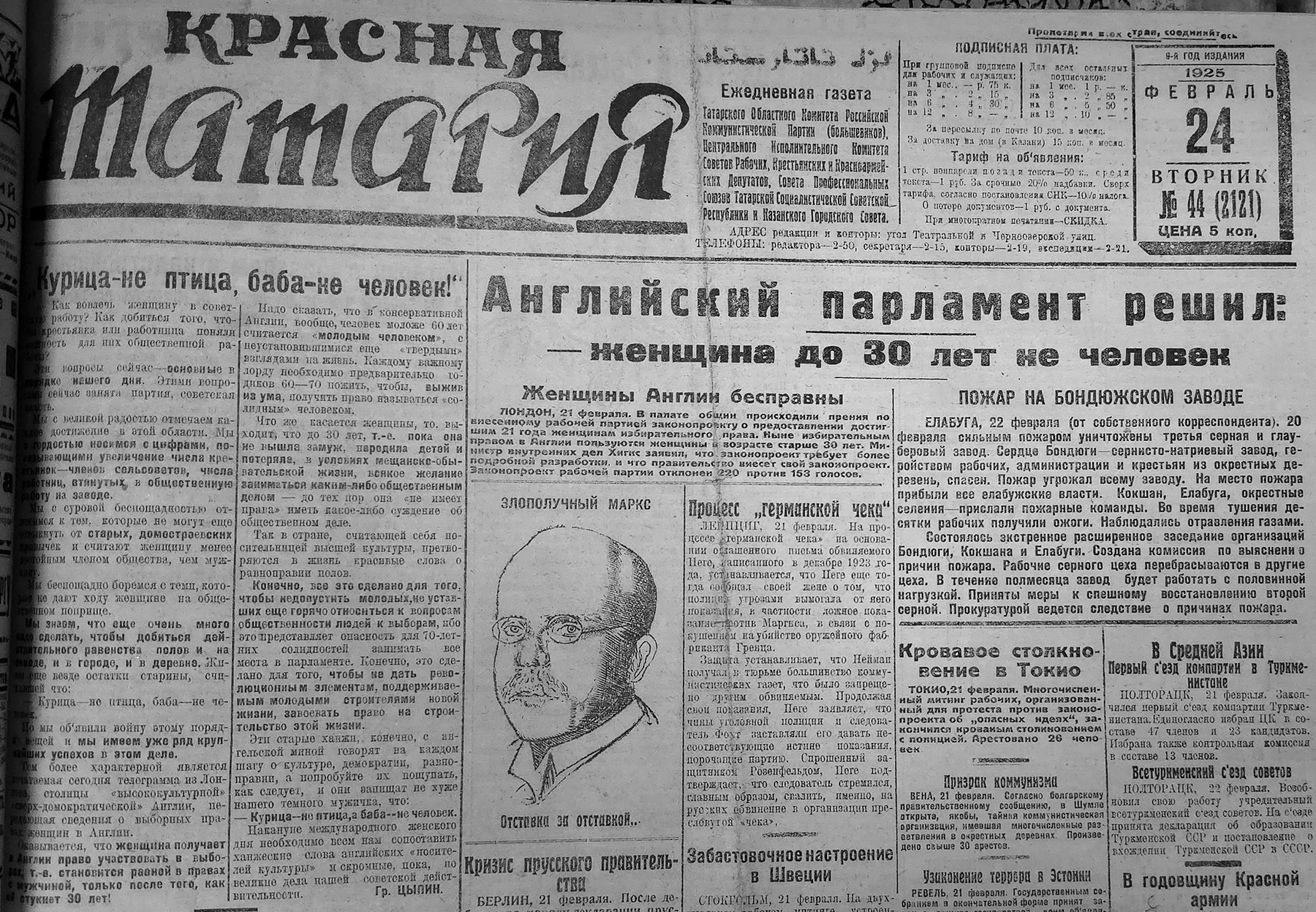 Женскую тему в «Красной Татарии» за 1925 год начали поднимать еще накануне 8 Марта. Так, главной темой номера за 24 февраля стал отказ британского парламента наделить женщин до 30 лет избирательным правом. Как выяснилось, накануне Рабочая партия Англии внесла в палату общин законопроект о предоставлении такого права женщинам, достигшим 21 года, но парламентарии проголосовали категорически против, сохранив прежний порядок: с 30 лет и точка.