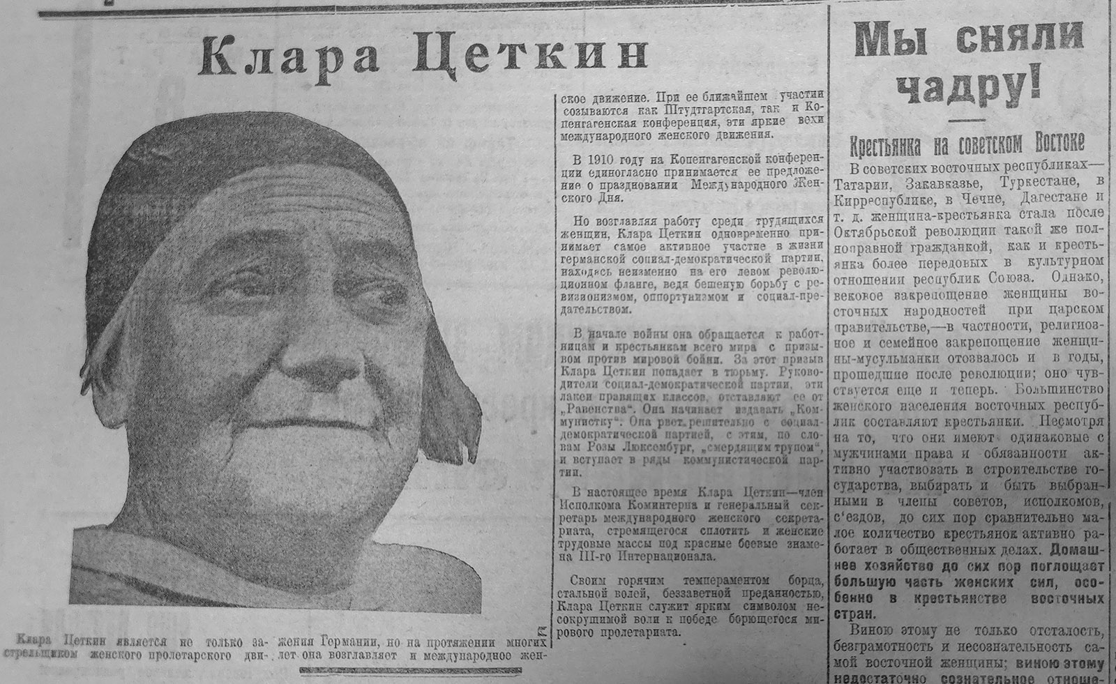 Здесь же опубликована заметка «Мы сняли чадру!» о том, как крестьянки советского Востока – Татарии, Закавказья, Туркестана, Киргизии, Чечни постепенно освобождаются от царского гнета, семейного и религиозного закрепощения и становятся полноправными гражданками новой, советской страны.