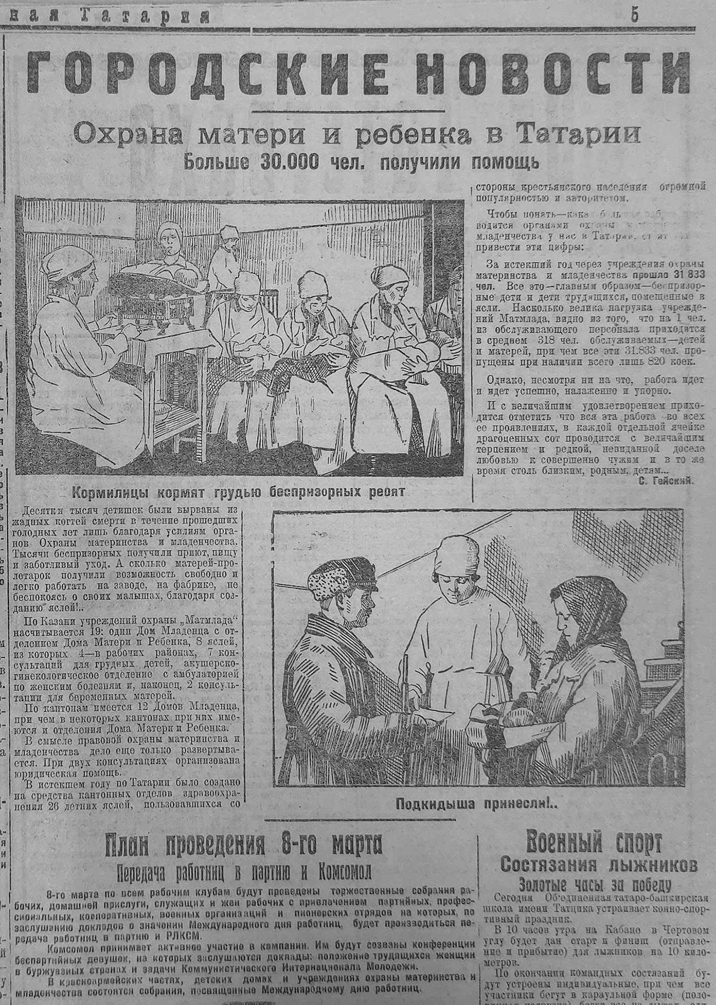 Трогательный рисунок, на котором кормилицы кормят грудью беспризорных малышей, иллюстрирует статью, как советская власть в Татарии охраняет мать и ребенка.