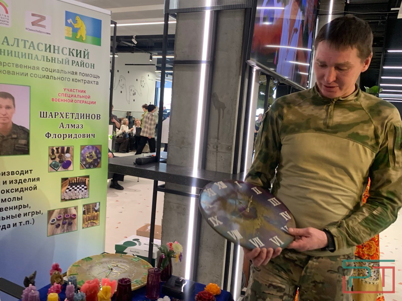 Алмаз Шархетдинов работает дома на кухне, и для семьи его хобби не очень удобно. У ветерана двое детей, а этой весной ожидается пополнение. Токсичные испарения сохнущей эпоксидной смолы могут навредить детям, поэтому он хочет взять деньги по соцконтракту, чтобы открыть мастерскую и расширить производство.