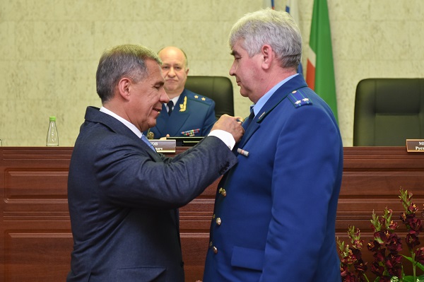 В завершение Рустам Минниханов вручил особо отличившимся сотрудникам прокуратуры государственные награды Республики Татарстан, сообщает пресс-служба Президента РТ.