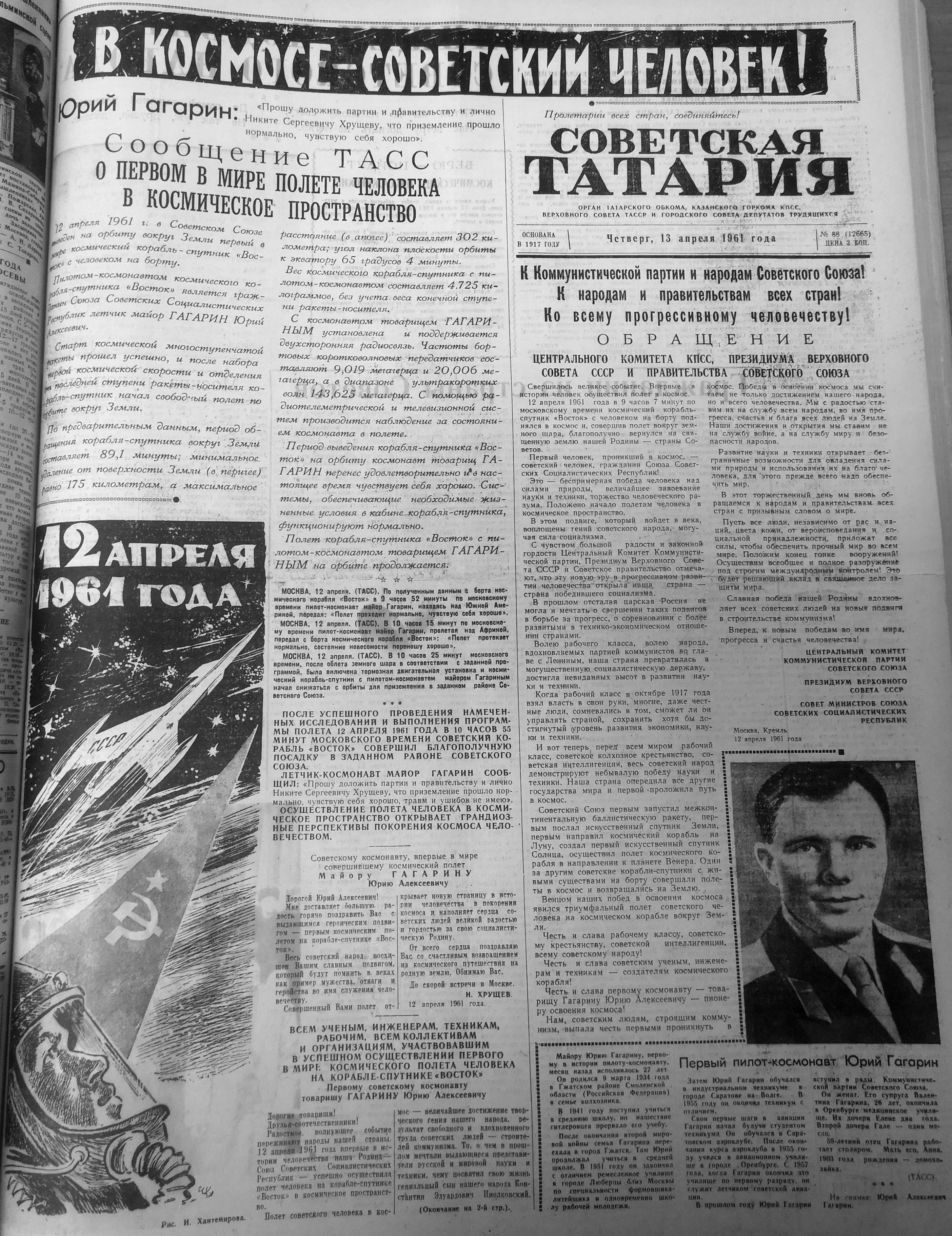 «В космосе – советский человек!» – с такой шапкой вышел номер «Советской Татарии» (ныне «Республика Татарстан») в четверг 13 апреля. Далее шли хроника полёта, обращение Центрального комитета КПСС, Президиума Верховного Совета и Правительства к советскому народу. Справа внизу на первой полосе номера – биография Юрия Гагарина и его фото. Космонавт запечатлён на снимке в военной форме. Он серьёзен – видимо, это протокольная съёмка. Однако совсем скоро СМИ всего мира будет растиражирована задорная гагаринская улыбка.
