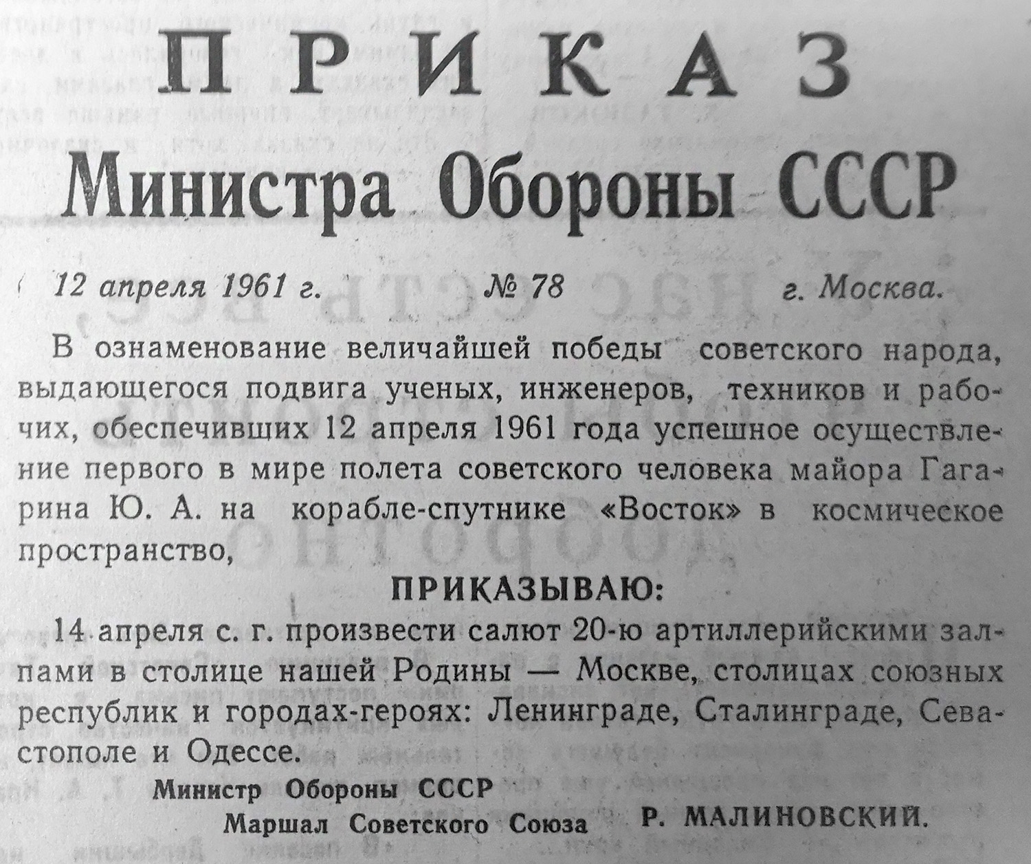 Напечатан и приказ министра обороны Родиона Малиновского, согласно которому 14 апреля в ознаменование величайшей победы советского народа, выдающегося подвига учёных, техников и рабочих, обеспечивавших первый в мире полёт советского космонавта, будет дан салют в Москве, столицах союзных республик и городах-героях Ленинграде, Сталинграде (в Волгоград его переименуют в ноябре 1961 года. – Прим. авт.), Севастополе и Одессе. В этот же день Гагарину присвоят звание Героя Советского Союза. Так закладывалась традиция чествования космонавтов.
