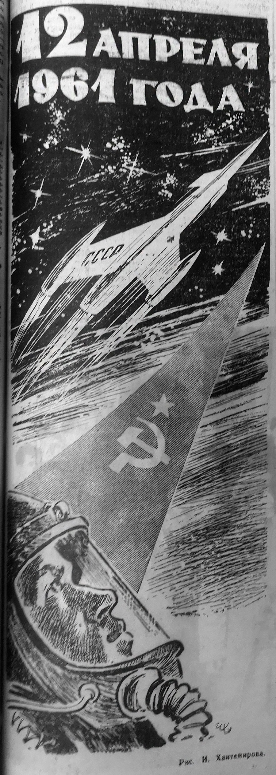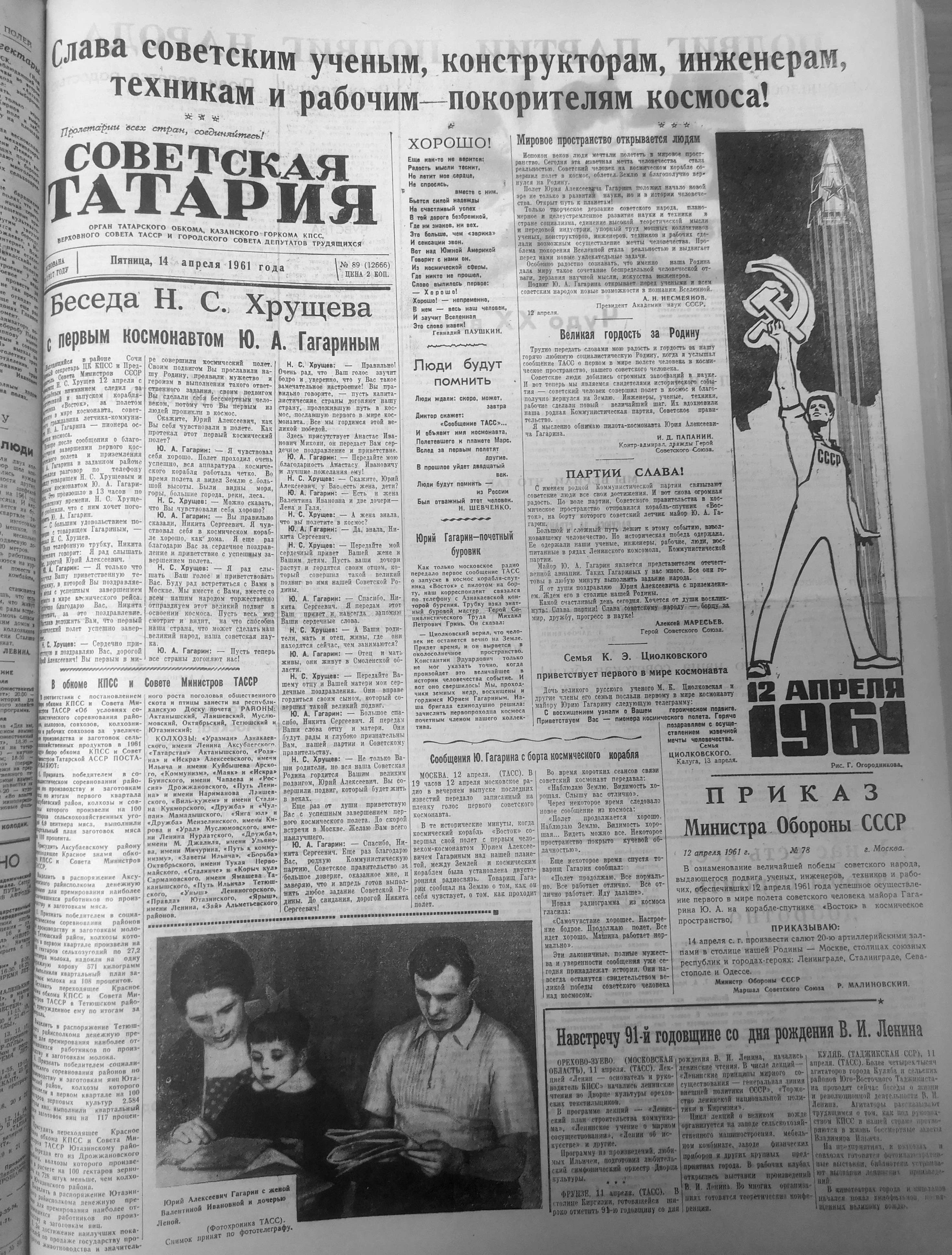 «Слава советским учёным, конструкторам, инженерам, техникам и рабочим – покорителям космоса!» – эта фраза задавала тон очередному номеру «Советской Татарии» за 14 апреля. В публикациях славят и партию, и народ, которые открыли мировое пространство людям. Уважения к советскому человеку труда добавляет рисунок Г.Огородникова: на фоне стартующей ракеты изображён рабочий, поднявший руку, в которой зажаты серп и молот. На комбинезоне пролетария надпись – «СССР». Несколько формальную беседу первого секретаря ЦК КПСС Никиты Хрущёва с Юрием Гагариным разбавляет семейное фото внизу полосы. В кадре – Юрий Алексеевич с женой Валентиной Ивановной и дочерью Леной.
