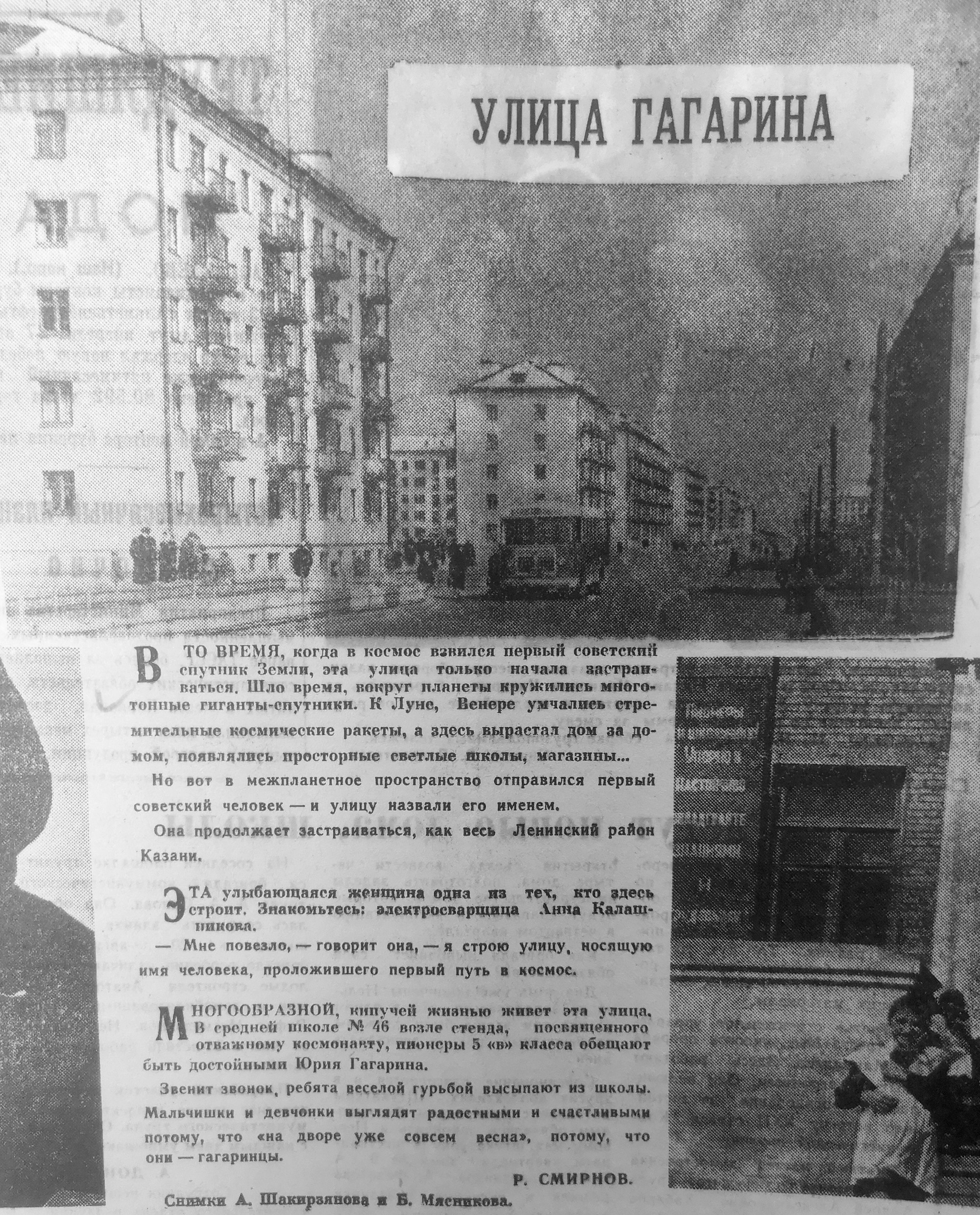 В газете улице Гагарина был посвящён специальный фоторепортаж. На снимках запечатлены ряды новых домов и автобус, в который садятся пассажиры. Ниже опубликован портрет электросварщицы Анны Калашниковой. Она была занята на возведении объектов и призналась: «Мне повезло – я строю улицу, которая носит имя человека, проложившего первый путь в космос». А в средней школе №46 возле стенда, посвящённого отважному космонавту, пионеры 5-го «В» обещают быть достойными Юрия Гагарина. Эти кадры и газетные строчки дают представление об эпохе и ритме жизни огромной страны тех лет.