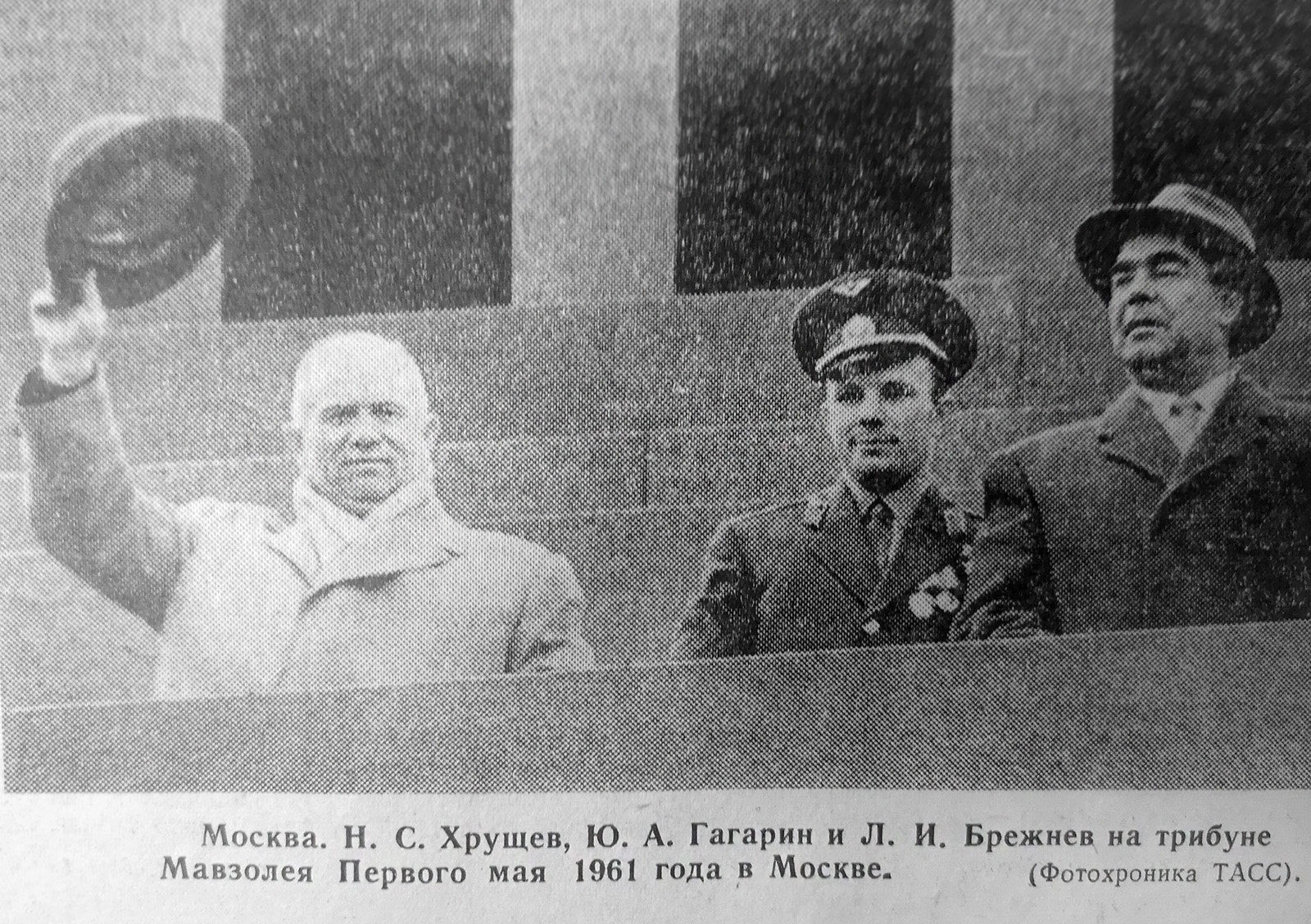Первомай в Москве, парад на Красной площади. На Мавзолее объектив фотографа ТАСС выделил троих: Хрущёва, Гагарина и Брежнева. Юрий Алексеевич – уже не просто первый в мире космонавт, а символ лидерских позиций Советского Союза. Очень скоро с миссией мира он отправится в триумфальное турне по разным странам. И даже королева Англии Елизавета II в нарушение всех норм этикета сфотографируется с Гагариным, объяснив это тем, что он не земной человек, а небесный. Правда, этой фотографии до сих пор нет в интернете, что наводит на мысль: а не миф ли это? Но даже если это легенда, то она очаровательна, как и сама гагаринская улыбка.