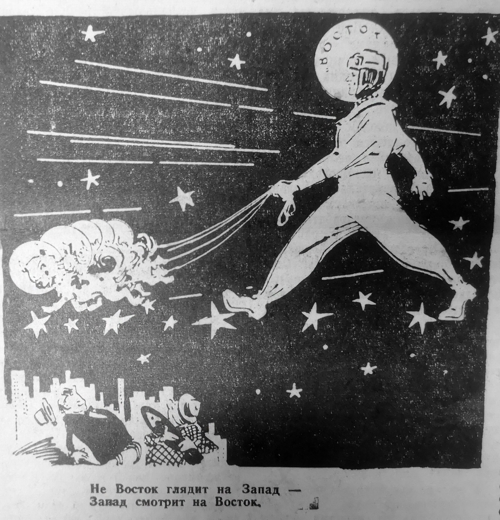 Карикатуры в прессе разных стран часто высмеивают недостатки своих геополитических оппонентов. Вот и в советских карикатурах художники на полную катушку использовали первенство наших космонавтов по отношению к их американским конкурентам. Например, такой рисунок: первый советский космонавт гуляет по звёздам и держит на поводке собак в шлемах (намёк на то, что четвероногие друзья проложили для людей путь в космос). Внизу на фоне небоскрёбов задрали головы империалисты, ошарашенные успехами СССР. И подпись: «Не Восток глядит на Запад – Запад смотрит на Восток».