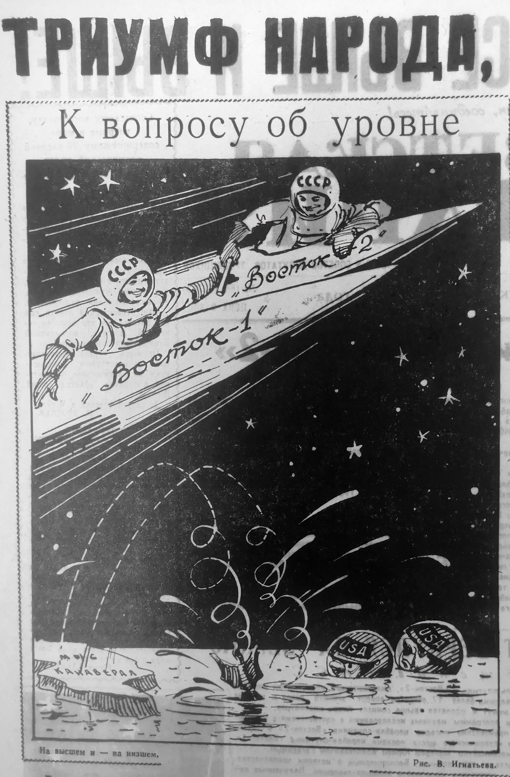 Дальше ирония крепчает. Карикатура в «Советской Татарии» художника В.Игнатьева. На космическом корабле «Восток-1» Гагарин передаёт эстафетную палочку Титову на корабле «Восток-2». Внизу еле держатся на воде два несостоявшихся астронавта из США. Текст гласит: «К вопросу об уровне. На высшем и – на низшем». Тут важно пояснить контекст. Между первым полётом в космос Гагарина в апреле и вторым полётом Титова в августе американцы на кораблях «Меркурий» совершили два суборбитальных полёта в мае и июне. Алан Шепард и Вирджил Грисс не облетали Землю и поднимались на высоту не более 190 км. А продолжительность их полётов составила всего 15 и 16 минут соответственно. Поэтому принято считать, что первым настоящим астронавтом в США стал Джон Гленн, который совершил полёт только в феврале 1962 года.