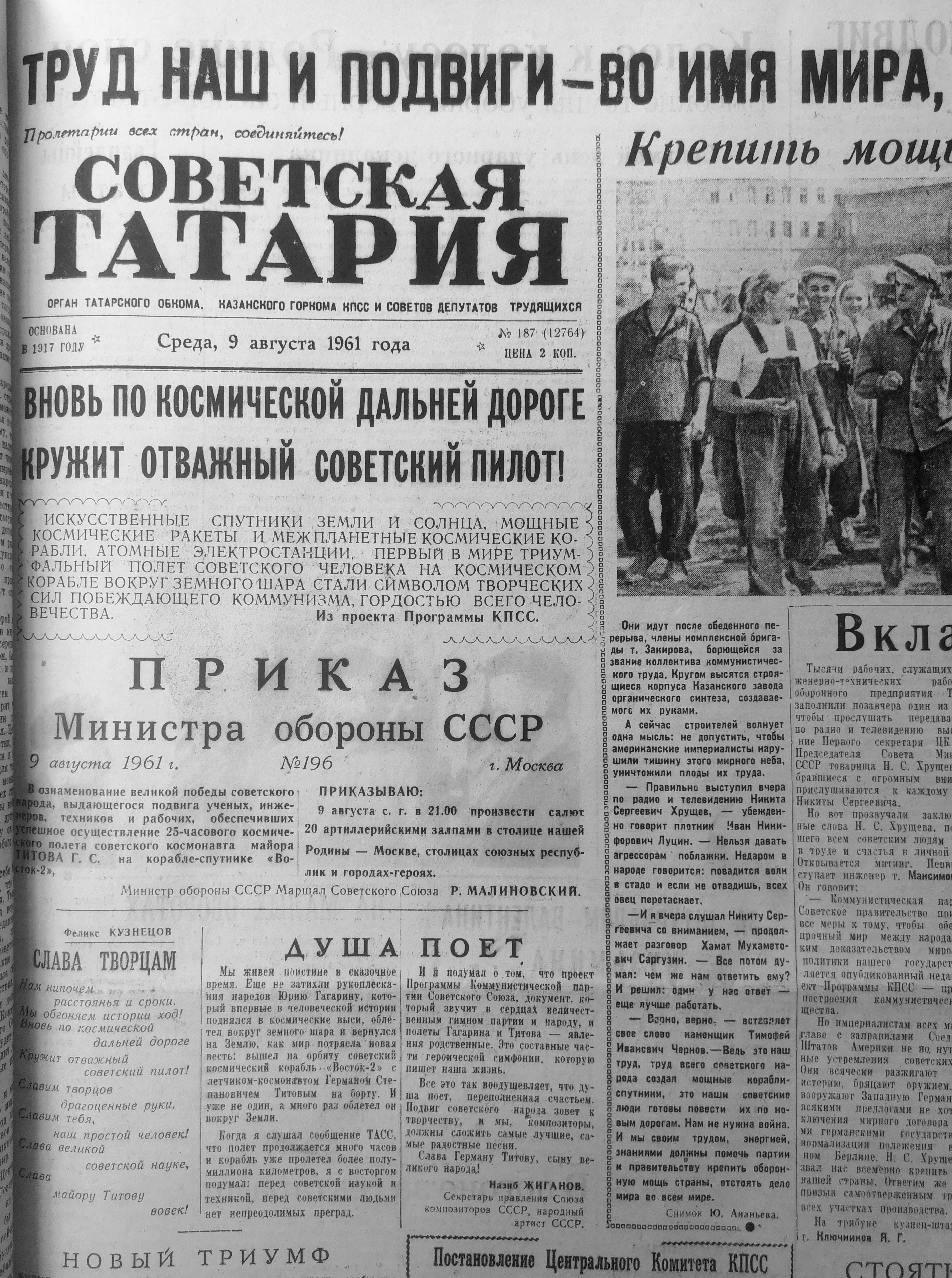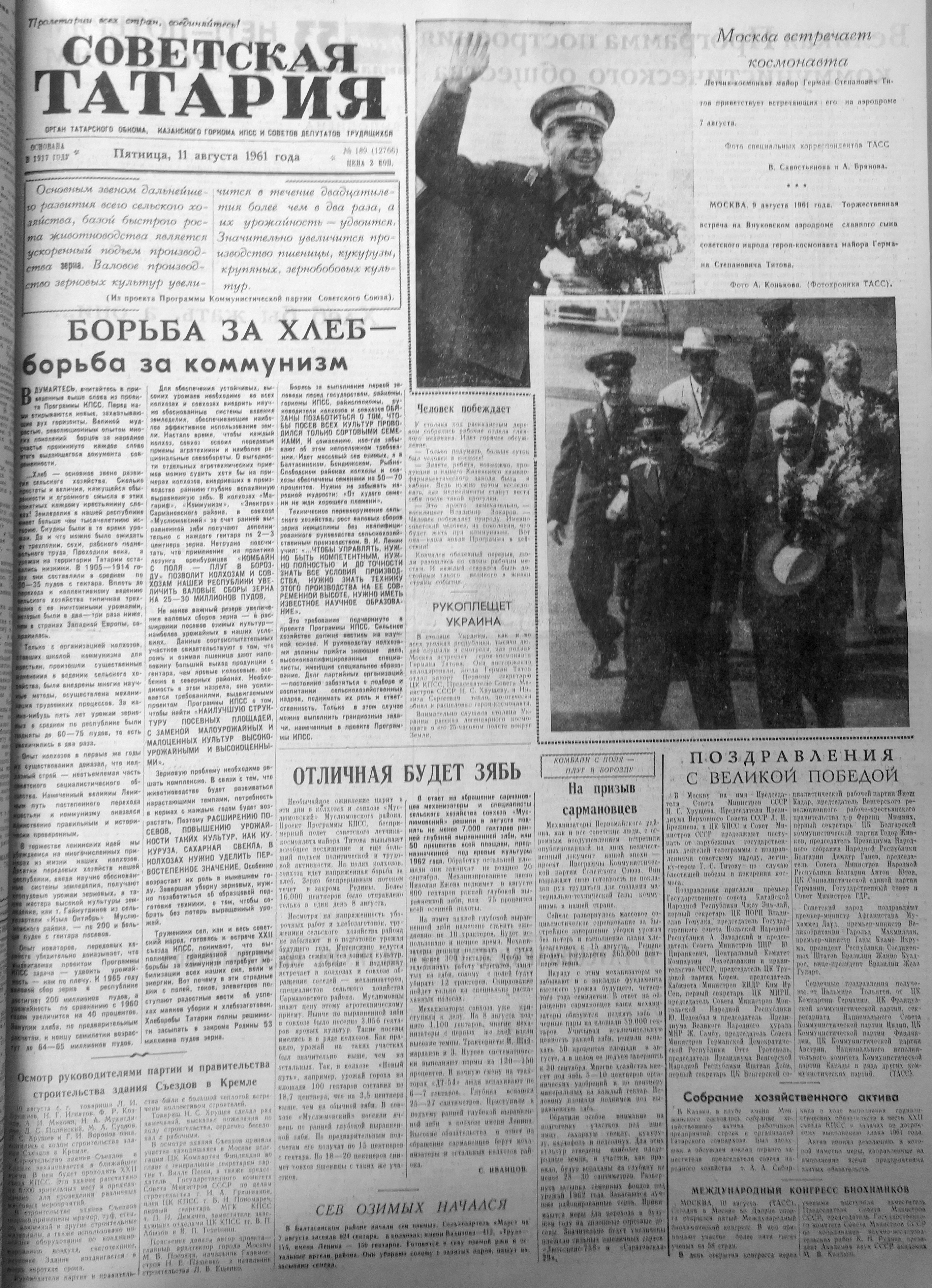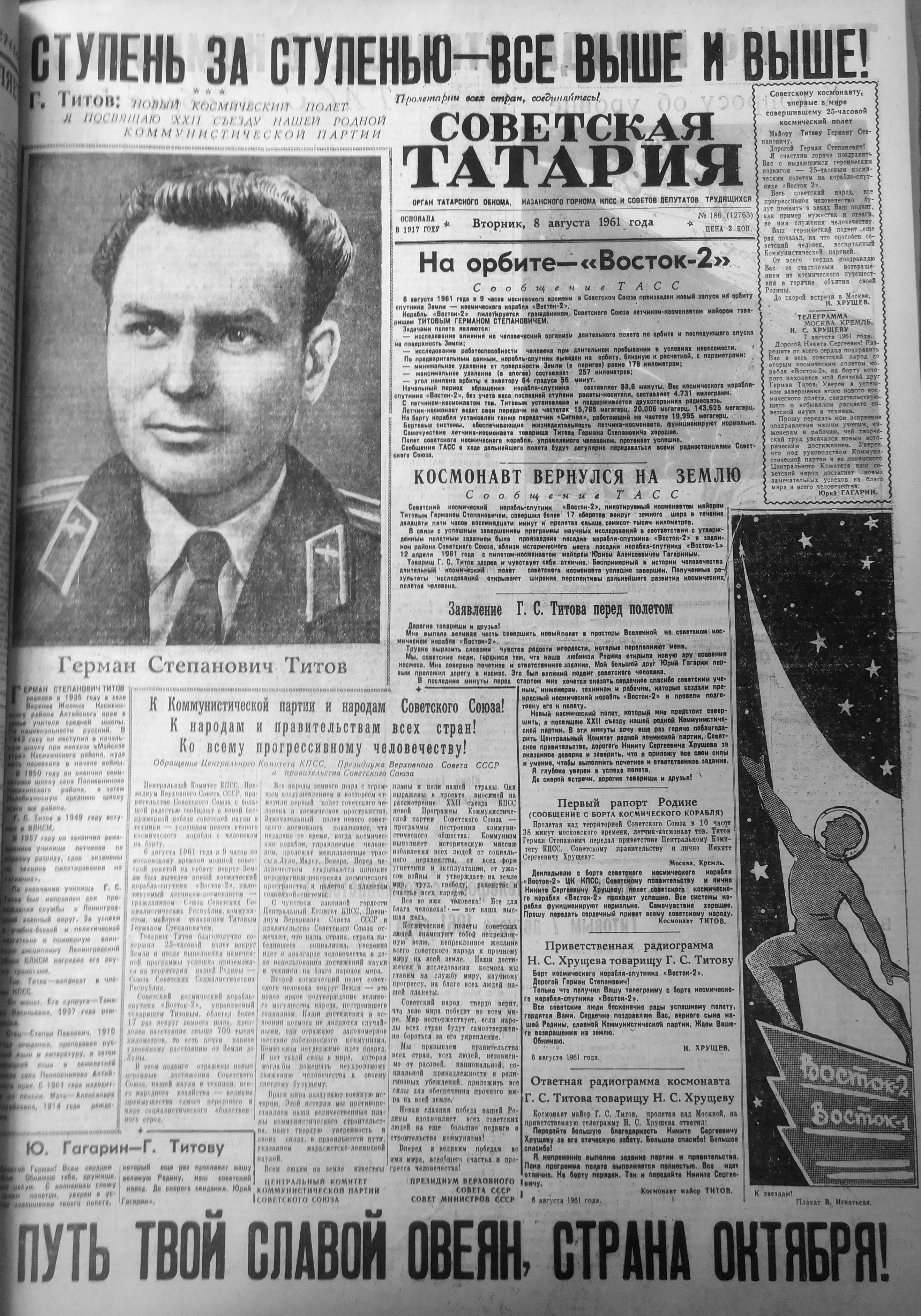 10 августа Герман Титов снова на первой полосе «Советской Татарии», заголовки бодры: «Здравствуй, отважный сын Отчизны!», «Нам подвластны космические дали!», «Встречаем всем народом, всей страной». Далее идёт описание торжественной встречи космонавта на Красной площади, приводятся речь Хрущёва и ответная речь Титова. Снова салют в честь вернувшегося из космоса нашего героя-соотечественника. Второму космонавту тоже присвоено звание Героя Советского Союза. И в газете на второй полосе уже традиционная фотография: члены артели «Татарстан» Высокогорского района с большим воодушевлением встречают сообщение о беспримерном полёте к звёздным просторам советского космонавта.