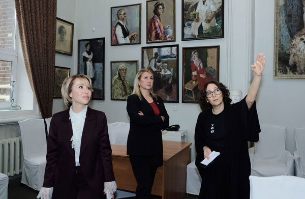 Экскурсию для заместителя министра культуры РФ Надежды Преподобной (крайняя слева) проводит директор КХУ им. Н.И.Фешина Ольга Гильмутдинова.