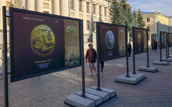 На крупных полотнах – изображения памятных монет, выпущенных Банком России и запечатлевших исторические моменты правления Петра I. Ни одна прославленная персона в России не была удостоена такого внимания со стороны художников-медальеров.