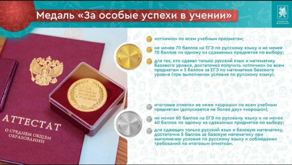 Так, уточнил спикер, для получения медали первой степени школьник должен получить отлично по всем учебным предметам и сдать ЕГЭ по русскому языку и еще минимум одному предмету не менее чем на 70 баллов каждый. Если же одиннадцатиклассник выбрал только русский язык и математику базового уровня, ему необходимо получить отлично по всем предметам и пять баллов на экзамене по математике.