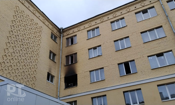 Приехав сегодня утром к зданию общежития №4, корреспондент «РТ» застала на месте снующих туда-сюда рабочих со стремянками и мотками новой проводки, уборщиц с ведрами тряпками, которые отмывают этаж от копоти, и сотрудников МЧС. С улицы видна зияющая черная дыра вместо окна на третьем этаже, через которую просматривается сгоревшая дотла комната.