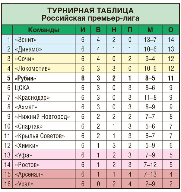 Расположение команд в турнирной таблице пусть и не отражает реального соотношения сил в чемпионате, но даёт определённую пищу для размышлений. Удачно стартовав, «Рубин» не сумел развить успех. На то, правда, были объективные причины – получается, что забивать в команде некому, а игроки, выходившие на поле в линии атаки, эффективно реализовать голевые моменты не сумели. Но Деспотович и Кварацхелия, пропустившие игры из-за травм и перебора легионеров, вновь в составе команды и готовятся к продолжению чемпионата.