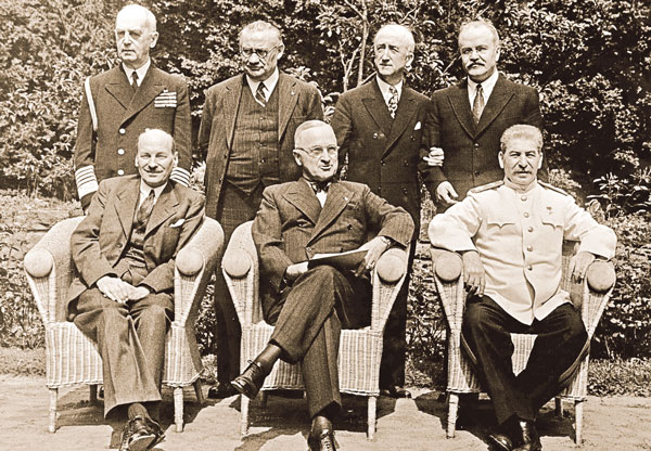 И всё же главным международным событием этих дней 75 лет назад стала открывшаяся в Потсдаме, небольшом пригороде Берлина, третья и последняя встреча «Большой тройки» – глав государств антигитлеровской коалиции. Советскую делегацию возглавлял председатель Совнаркома и Госкомитета обороны СССР Иосиф Сталин, американскую – президент Гарри Трумэн, британскую – сначала премьер-министр Уинстон Черчилль, а с 28 июля, после смены консервативного правительства в Великобритании лейбористским, – Клемент Эттли.
