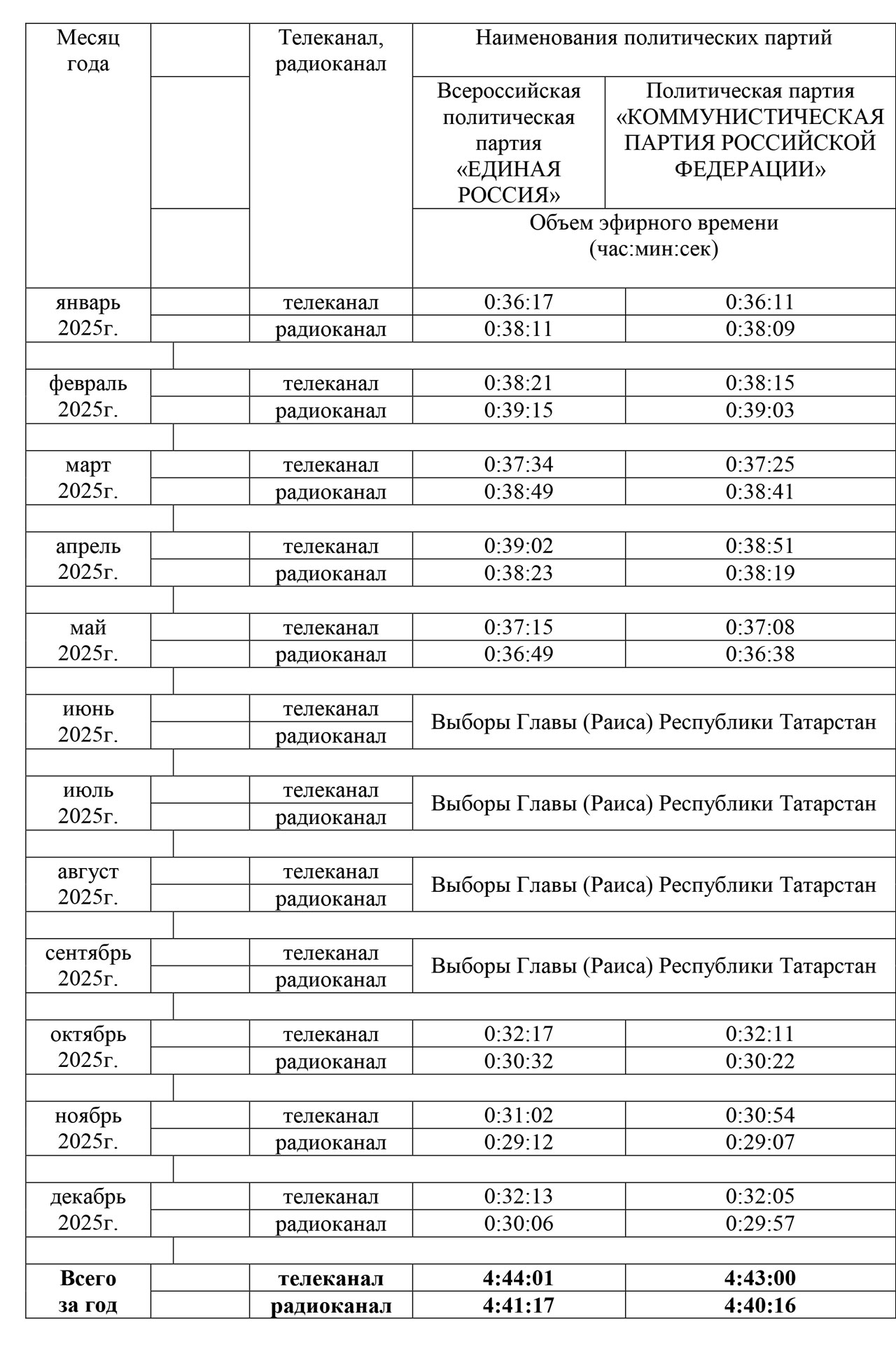 Сведения об обеспечении гарантий равенства политических партий, представленных в Государственном Совете Республики Татарстан, при освещении их деятельности региональными телеканалом «Телевидение «Татарстан - Новый Век» и радиоканалом «Радио «Татарстан - Новый Век» за 2025 год