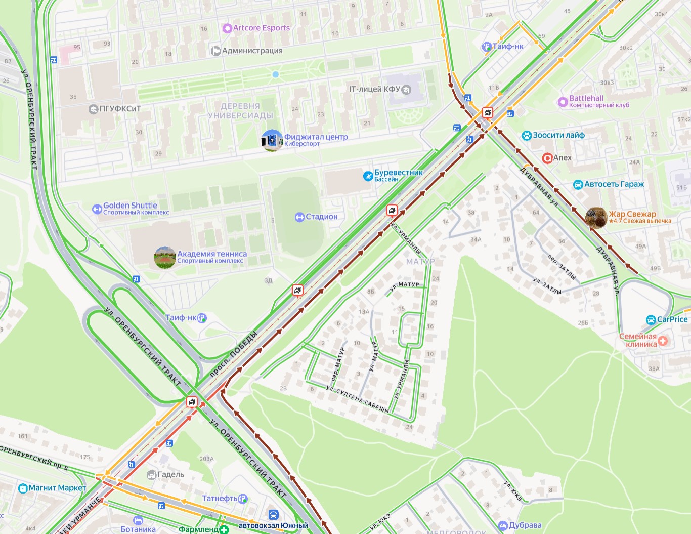 Автомобильное движение затруднено по самой улице Дубравная, а также по проспекту Победы и на участке Оренбургского тракта, который выходит на проспект Победы.