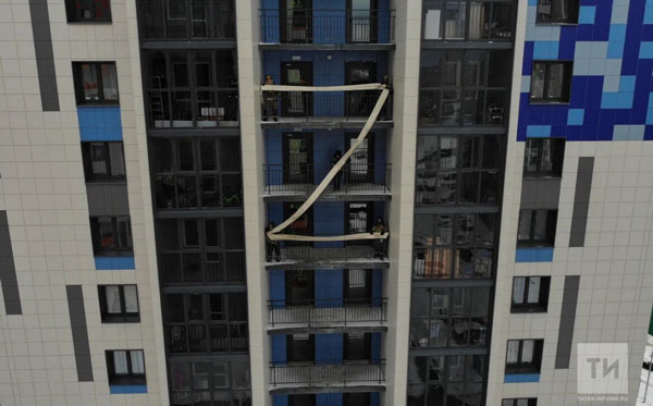 В Зеленодольске в завершение противопожарных учений в 18-этажном жилом доме сотрудники местного пожарно-спасательного гарнизона сложили букву Z на самом доме.