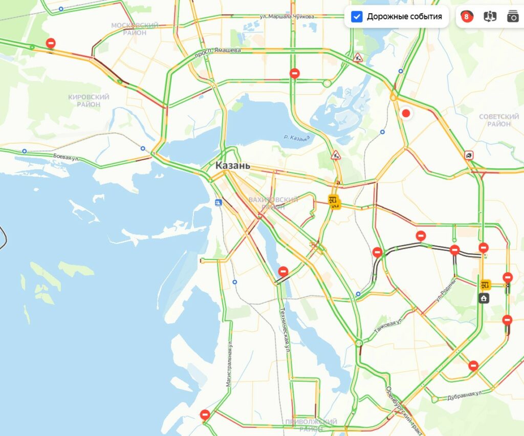 Сегодня вечером пробки в Казани достигли 8 баллов, согласно сервису "Яндекс.карты".