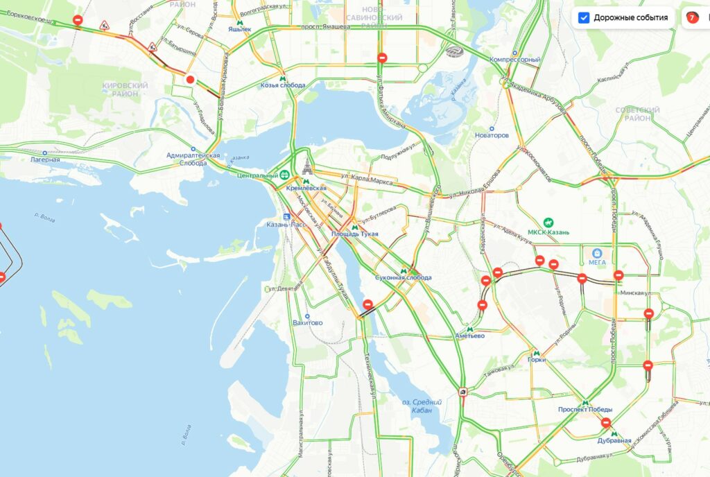 Как видно на сервисе "Яндекс.карты" дорожному движению в столице Татарстана мешают масштабные строительные работы и ДТП.