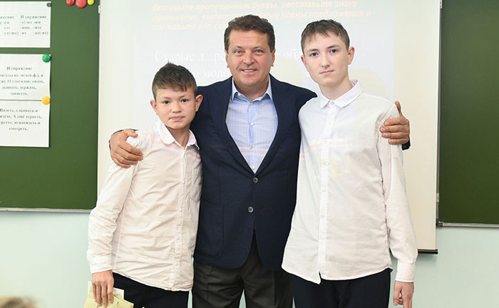 Ильсур Метшин подарил братьям смартфоны, чтобы они были на связи с отцом, а также пожелал одноклассникам ребят успешного учебного года и сделал памятное фото с братьями (на снимке).