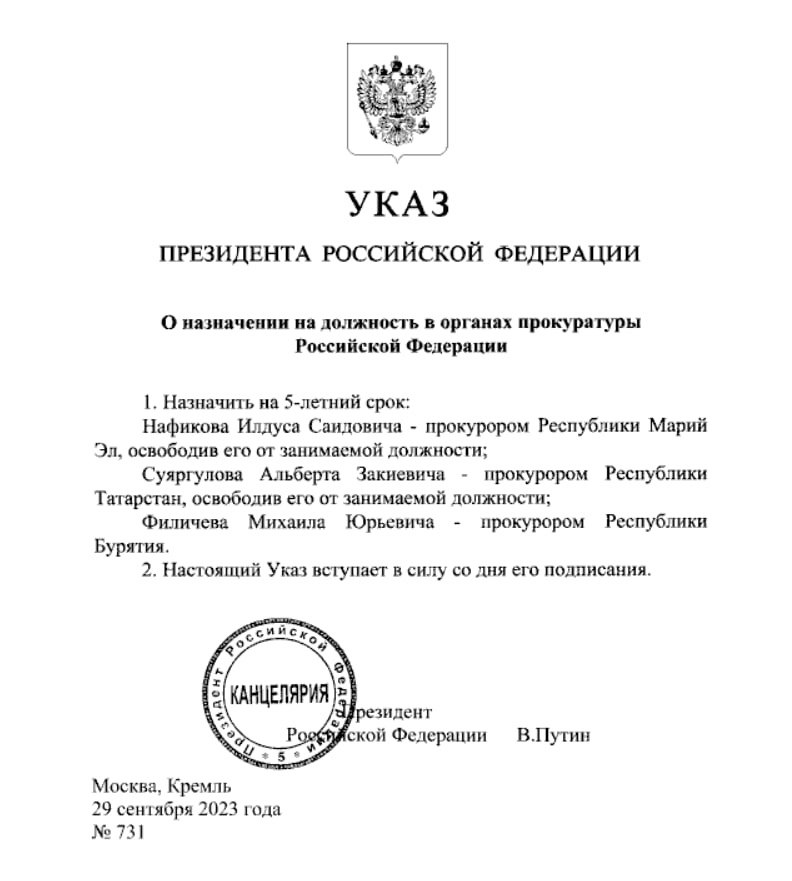 Прокурором Республики Татарстан назначен Альберт Суяргулов. Соответствующий указ подписал Президент России Владимир Путин.